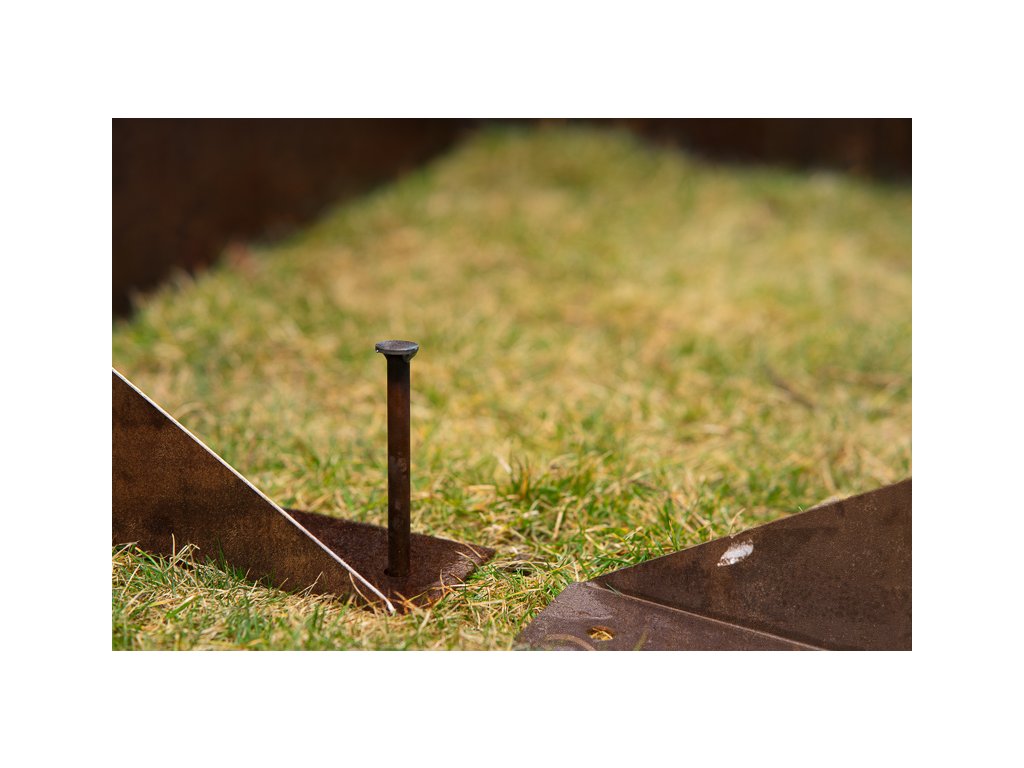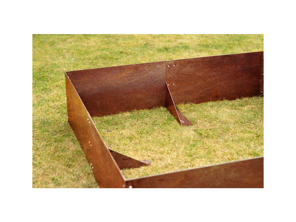 Konstrukci tvoří pevné plechové bočnice, které jsou v rozích spojeny L profilem pro vyšší stabilitu. Delší strany záhonu jsou vyztuženy svislou konzolí, která zároveň slouží jako kotvicí prvek. Pomocí aretačních kolíků se celý záhon bezpečně upevní k zemi, což zajišťuje pevnost a stabilitu i při plném zatížení.