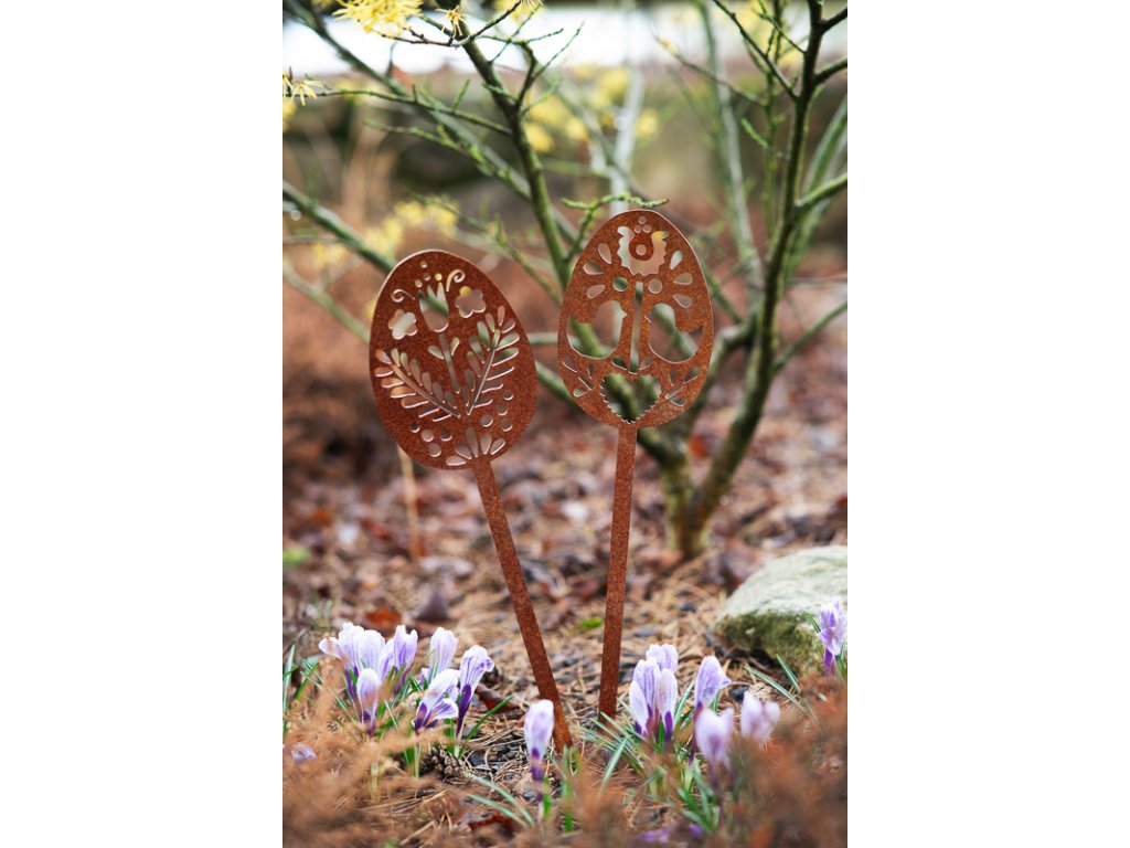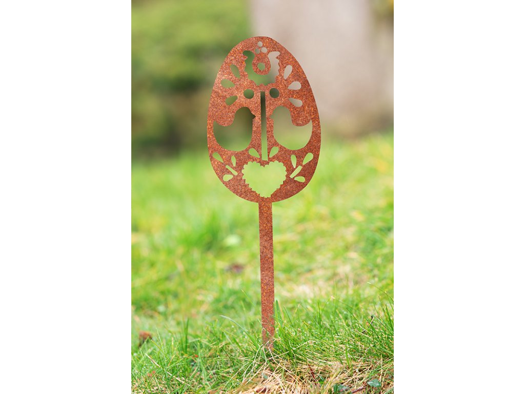 Zapichovací trn umožňuje snadné a pevné umístění do hlíny – bez nutnosti dalšího upevnění. Díky povrchové patině, která vzniká přirozenou oxidací, získává kraslice přírodní, zemitý tón, který krásně ladí s ostatní zelení i dřevěnými prvky.