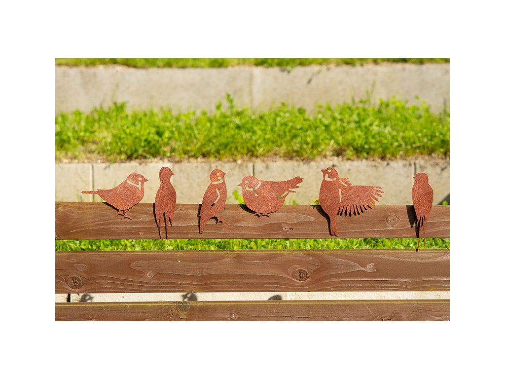 - cortenová silueta sedícího vrabce s montážním plechem